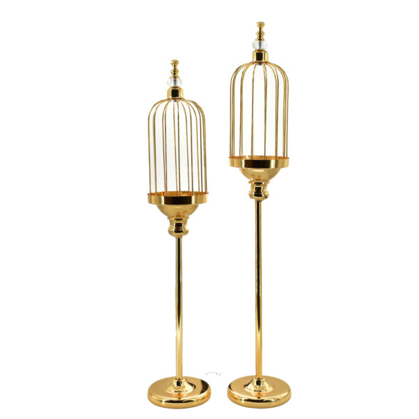 Διακοσμητικά φανάρια Δαπέδου – Κρεμαστά από μέταλλο χρυσού χρώματος με παλαιωμένο φινίρισμα. Διατίθενται σε σετ των δύο (2) τεμαχίων.